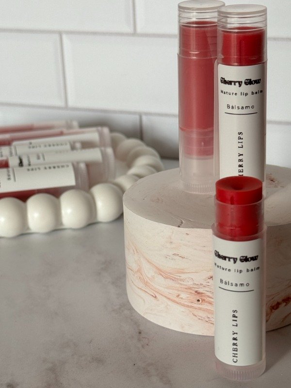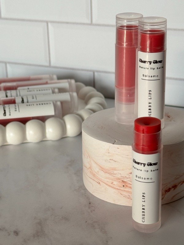 • 🍒 Cherry lips: con aceite esencial de menta y tea tree. Con un tono rojo rosado.