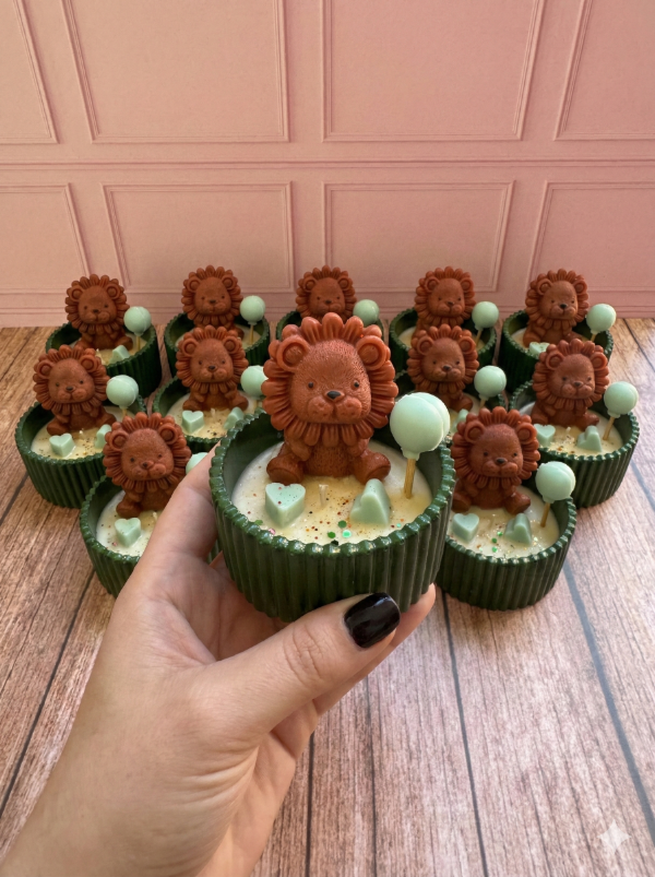 Souvenir 100% personalizable (color del envase de yeso, color del león, globo, corazones y aroma)